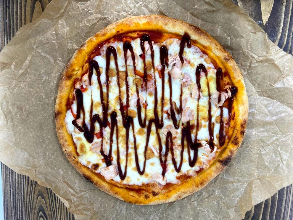Тесто, соус мутти, куриное филе, болгарский перец,соус барбекю