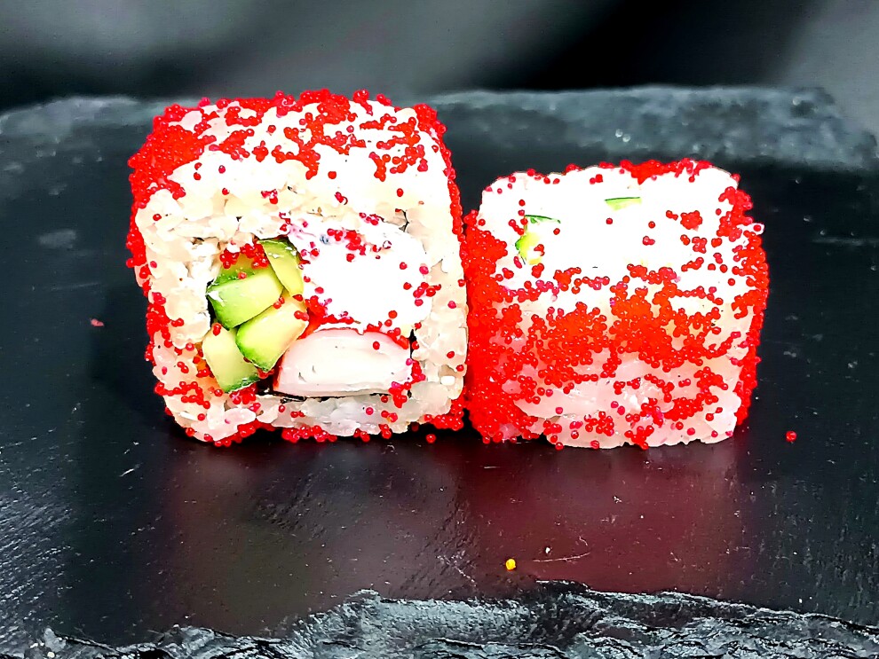 Состав: рис, тигровая креветка, краб, огурец, тобико оранжевая.