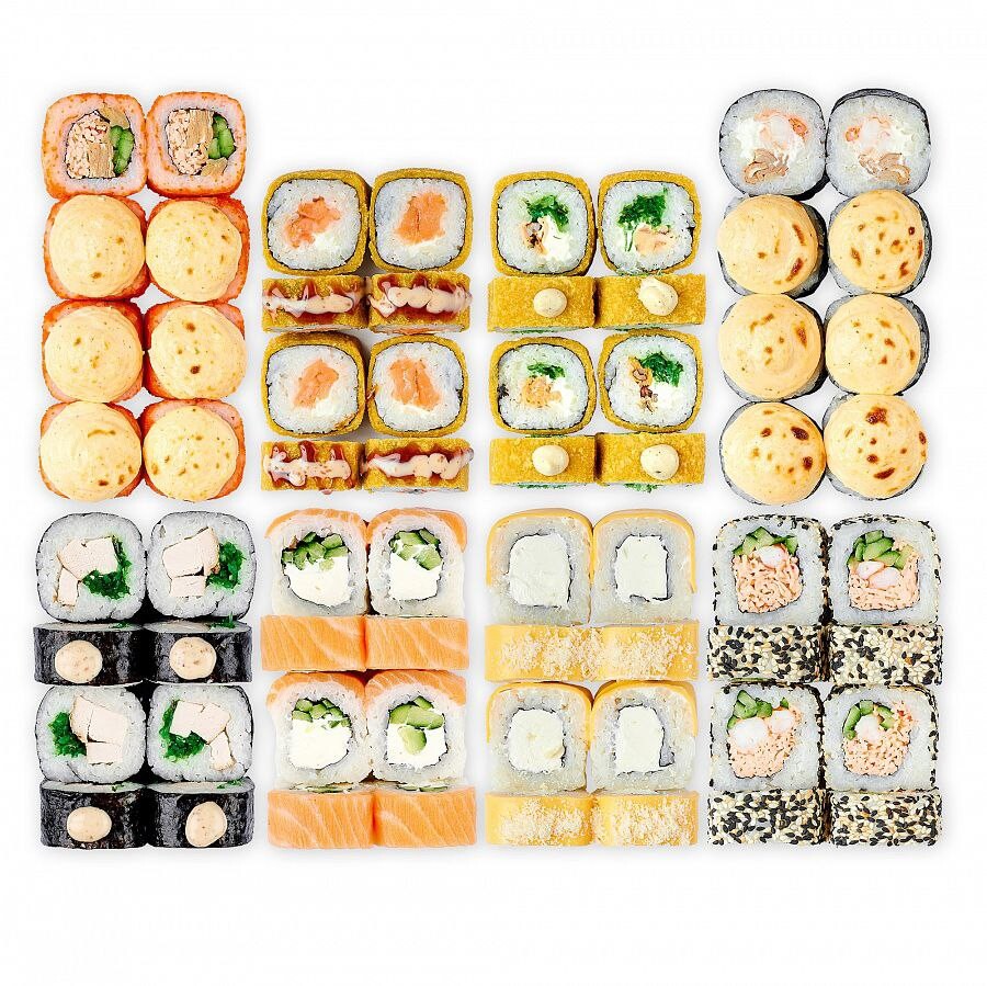 Разнообразный сет включает в себя запечённую Калифорнию, сливочный ролл с креветками и Филадельфию лайт. Дополняют набор хосомаки с курицей, сырный ролл, Токио и ролл с лососем, а также терияки чукка. Каждый ролл вносит свою ноту в общее впечатление от блюда / 56 шт.